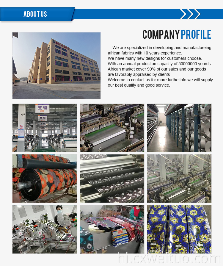 हम 10 साल के अनुभव के साथ गोल्डर्न अफ्रीकी प्रिंट के पेशेवर निर्माता हैं। हमारे पास आपके चयन के लिए नवीनतम और विभिन्न डिजाइन हैं, आपके डिजाइनों के अनुसार उत्पाद भी कर सकते हैं।